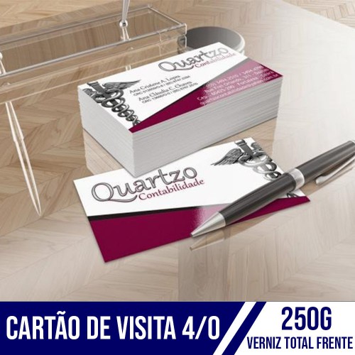 Cartão de visita impresso através do sistema offset disponível nas cores 4/0, 4/1 e 4/4. Utiliza como substrato papel cartão triplex C2S 250g/m² com as duas faces lisas e brilhantes. Para fins de enobrecimento recebe aplicação de verniz total high gloss 1/0.